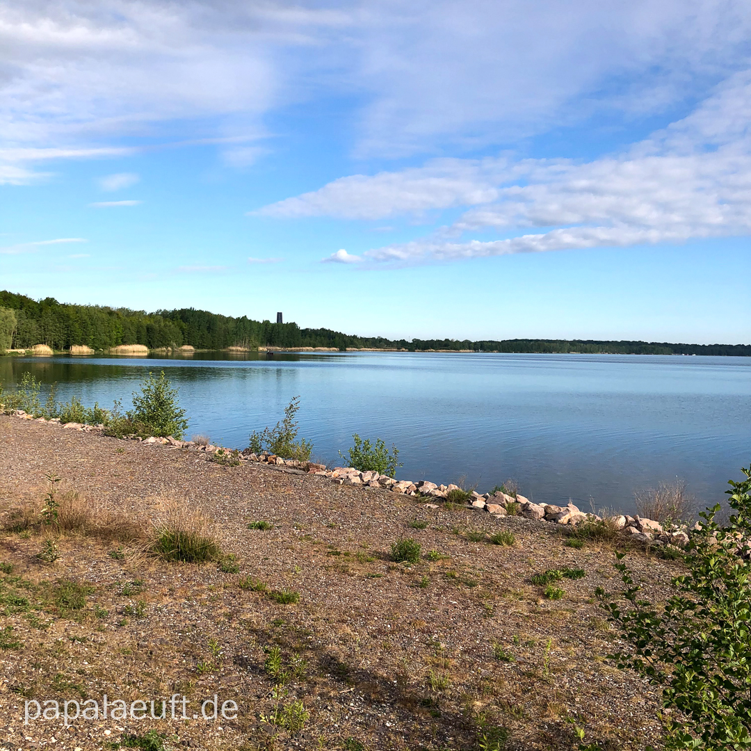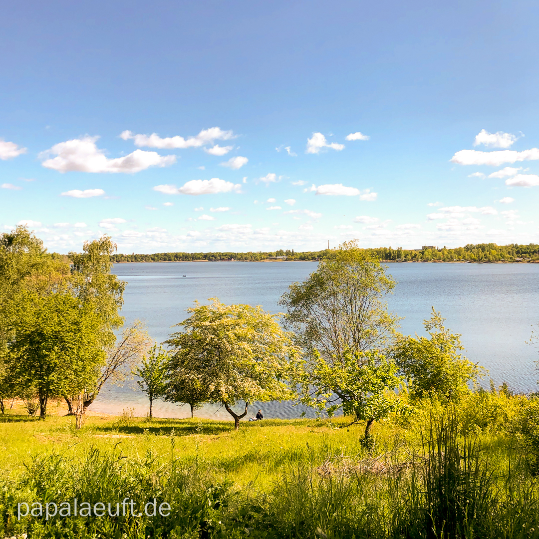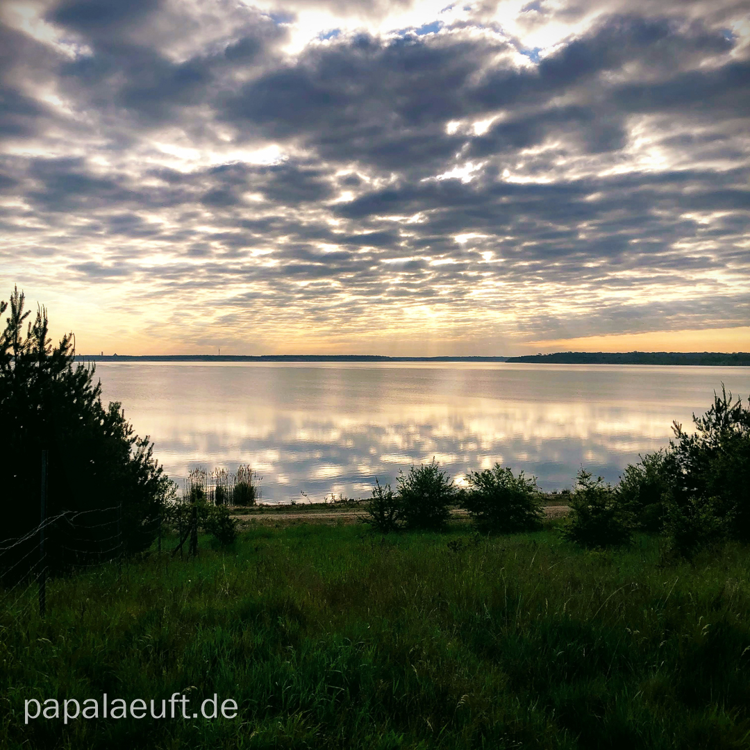 6:00 Uhr: START! Es geht locker los. Beine sind Leicht. Vöglein sangen Lieder. Locker, leicht erreiche ich den Zwenkauer See. Kein Mensch da. Die Sonne lacht. Wölkchen zieren den Himmel. Am Südufer wird es „voll“. Eine Handvoll Menschen ist unterwegs. Ein Radler überholt mich arschknapp, ansonsten keine besonderen Vorkommnisse. Es ist Zeit, ein paar Geburtstags- und Hochzeitstagsgrüße rauszuhauen – ich habe ja Zeit. Viel Zeit. Dennoch: Die Halbmarathonmarke schon nach unter 2 Stunden sind eigentlich zu schnell. Egal – zur Not wird am Schluss gewandert; passiert ist passiert. Hinter’m Zwenkauer See erwartet mich der Cossi. Kurz nach 8 sind schon einige Leute unterwegs. Nach 29 Kilometern erreiche ich wieder mein zu Hause und stärke mich, schlüpfe in ein luftigeres Oberteil und entledige mich für die nächsten 14/15 Kilometer des Laufrucksacks.