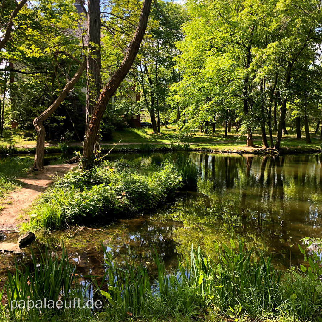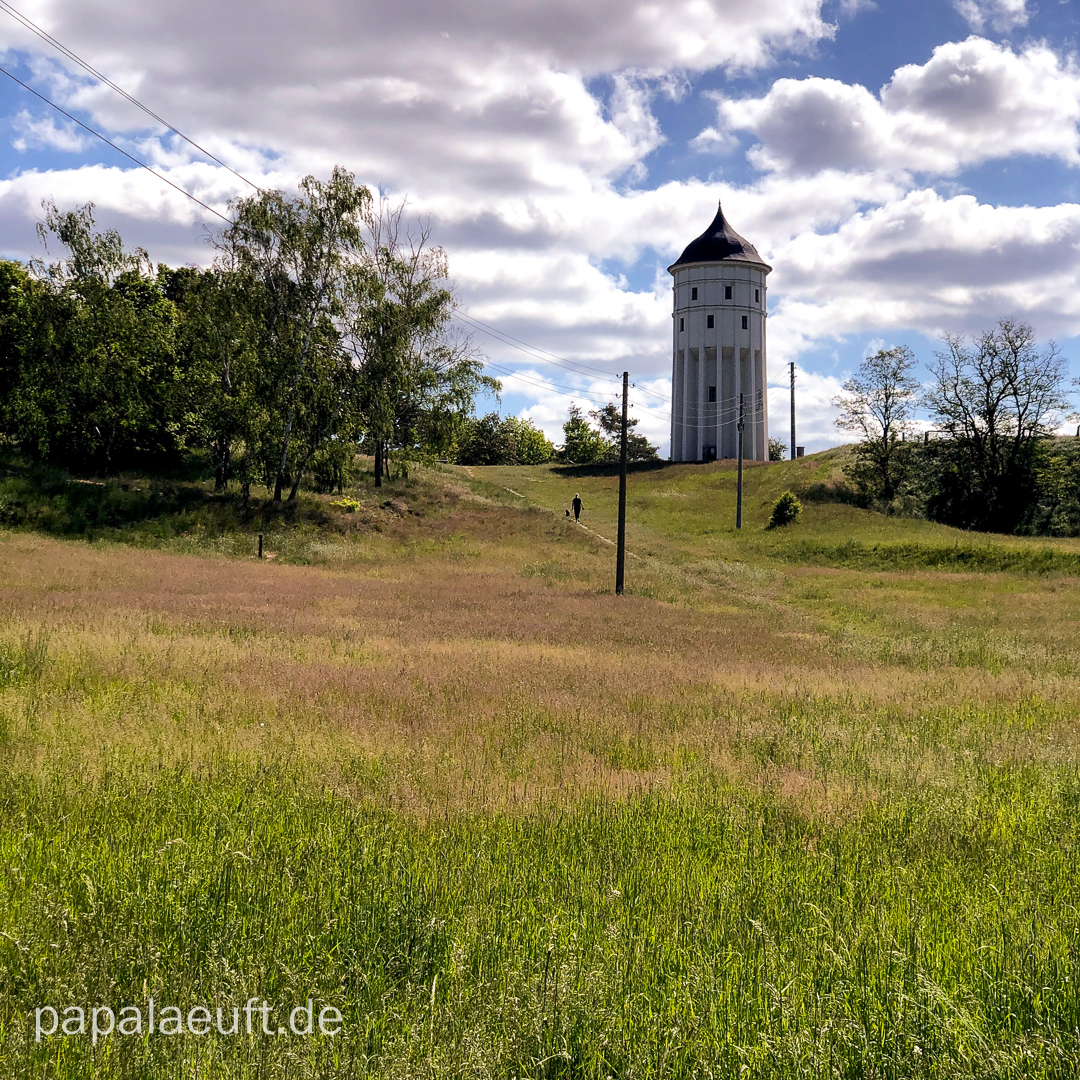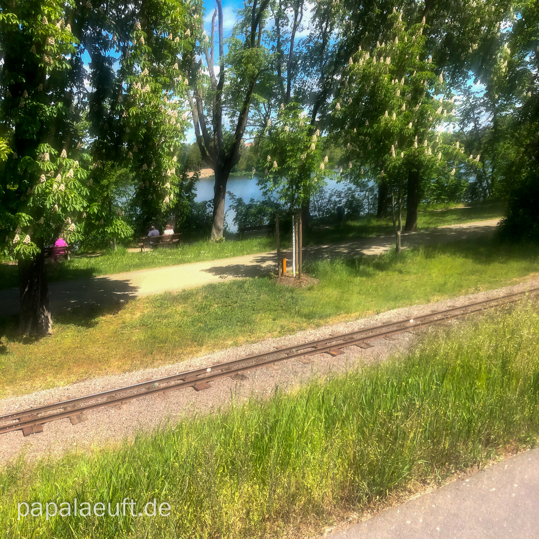 Es ging durch den Bienitz. Während ich in Miltitz noch in alten Kindheitserinnerungen schwelgen konnte, betrat ich nun Neuland. Schöne Gegend. Sehr schön! Da ich dann bis kurz vor’m Auensee meine Strecke an die Krügerstrecke angepasst habe, durfte ich auch die ehemalige Deponie Jahnstraße rauf. Nach gut 50 Kilometern fing es an, anstrengend zu werden. Die erste Gehpause musste her. Hinter einem kleinen Örtchen, von dessen Existenz ich bislang nix wusste, wurde es ein wenig trailig, aber ohne R ist es eben ohne R. Am „Grenzadler“ a.k.a. „Torstens Oma“ (die aber nicht Torstens Oma war – aber das ist eine andere Geschichte) ausgiebige Mittagspause, Schwätzchen mit der Standbetreuung inclusive. Die Softflaschen konnte ich mit Wasser auffüllen und es ging durch den Lützschenaer Schlosspark. Kurz danach trennten sich die geplanten Wege, und ich blieb nördlich der Luppe, um zum Auensee zu kommen. Ich hatte wieder einigermaßen Kraft und konnte ganz gut laufen, aber ans Knipsen habe ich außer mal kurz am Auensee überhaupt nicht gedacht. Egal, aber jetzt wird es noch textlastiger als ohnehin schon.