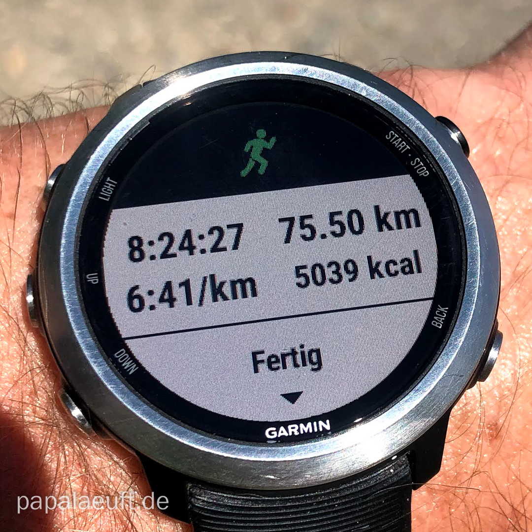 75,5 Kilometer | 8:24:27 h | reichlich 5000 kCal stehen auf der Uhr. Es gibt den ersten Schluck Schwarzbier. Ab nach Hause, Füße hoch, ausruhen, duschen, …